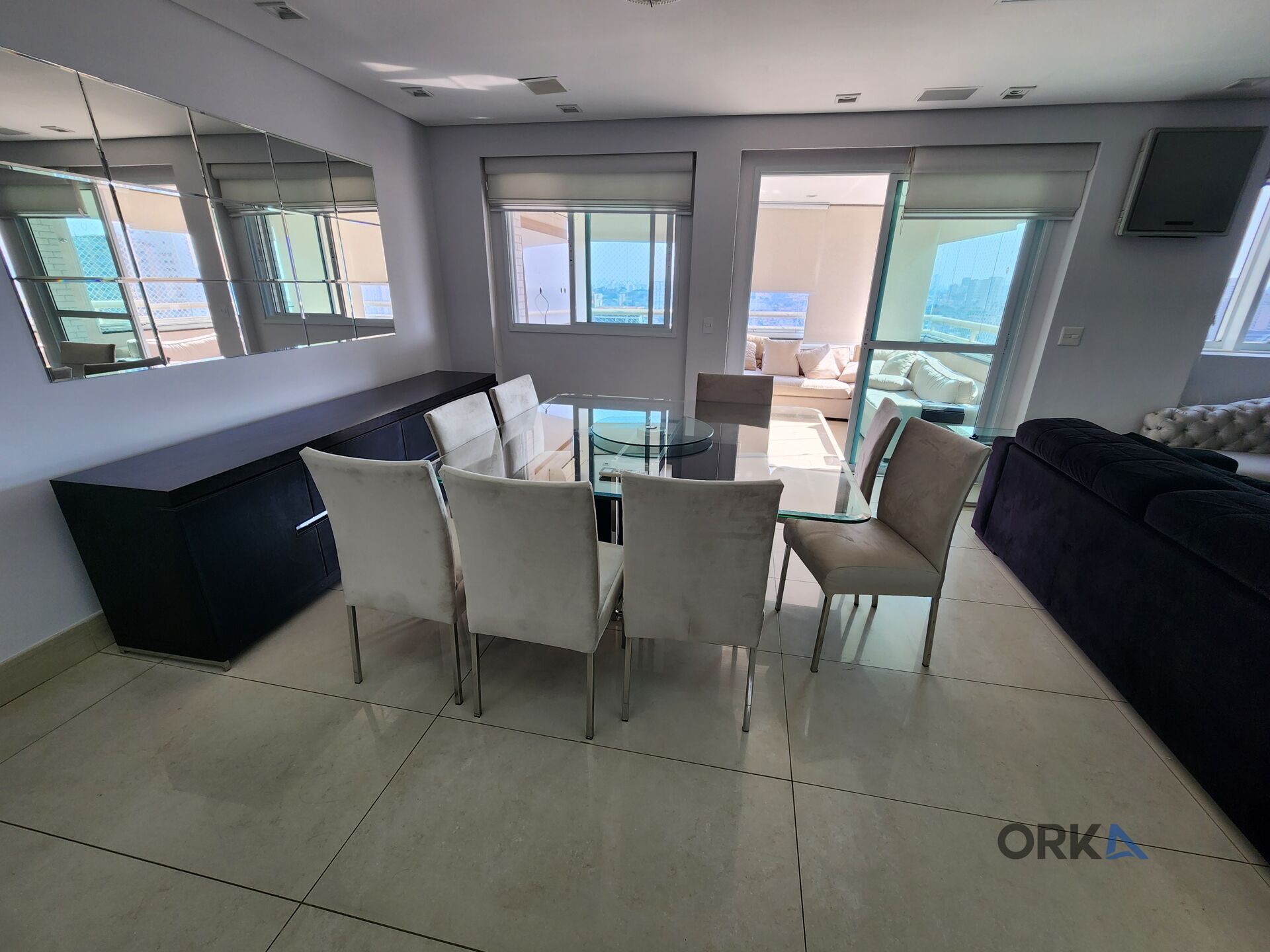• Ampla sala de estar decorada com móveis Breton, ar-condicionado, mesa de jantar para 8 pessoas e lavabo;
