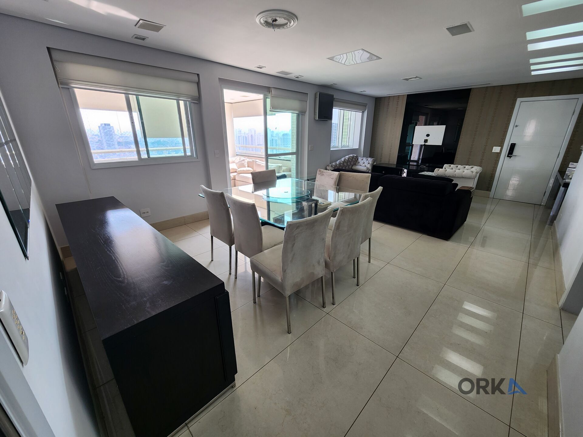 Todo o apartamento foi decorado com acabamento de primeira linha, incluindo mármore, porcelanato, papéis de parede e móveis laqueados. Conta com armários planejados da Ornare, móveis em tinta automotiva e janelas amplas com vista livre, proporcionando um ambiente arejado e iluminado.