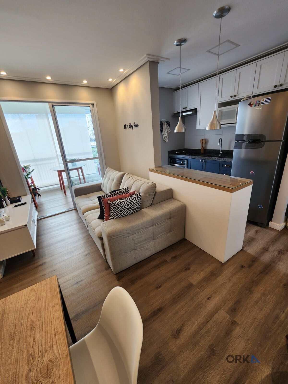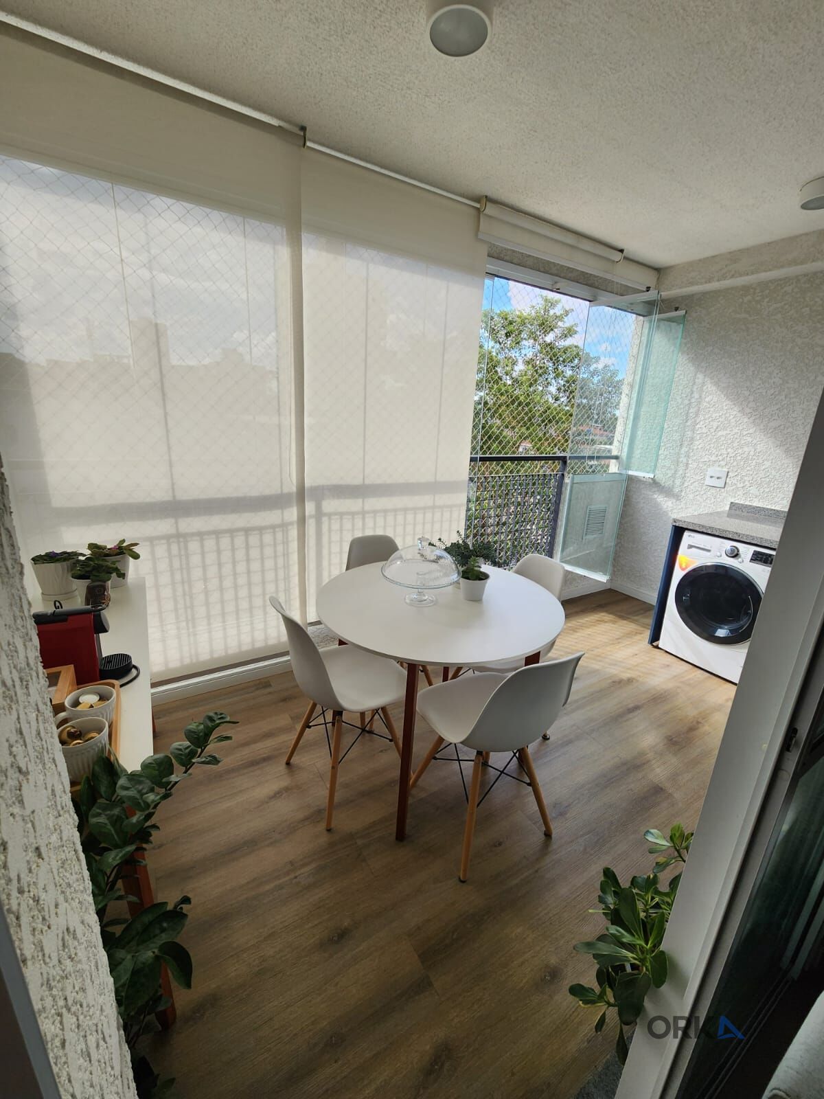 Entrando no imóvel notamos um ambiente com decoração leve e de alto padrão, com móveis planejados de 1ª linha, a sala tem bom espaço para mesa de jantar, sofá e TV, indo para varanda que está envidraçada e com persianas temos um charmoso espaço para café e também uma bancada em mármore com uma pia, armários e espaço para máquina lava e seca.