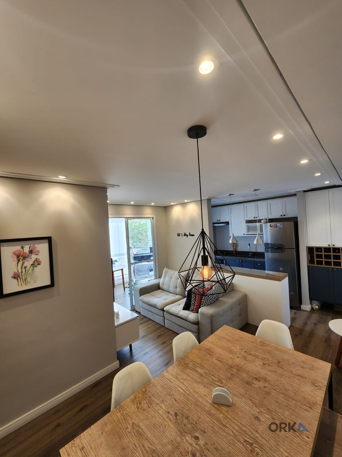 O ambiente da sala é dividido por um lindo balcão com tampo de vidro e armário, além de 2 lindos pendentes, adentrando temos uma rica conexão de cores com armários em azul naval e em branco, com lindo contraste dos puxadores em dourado. Ao lado temos um dispensa com armários e espaço para vinhos. Temos um banheiro de apoio com pia em mármore e cuba de porcelana e box de vidro.